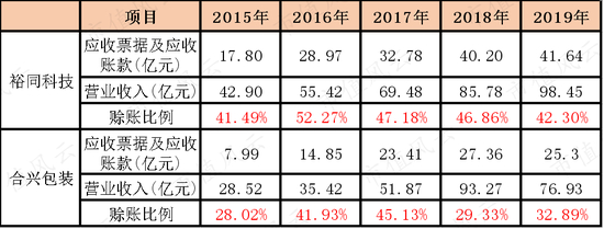结合营收情况可发现,裕同科技的赊账比例居高不下,常年在40%以上,而合兴包装曾连续两年突破40%,2019年下跌至30%附近,表现更优。