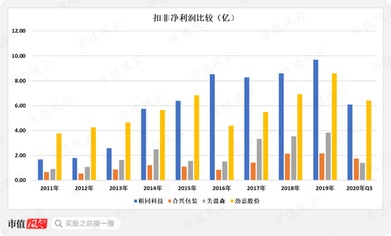 和营收的情况截然相反,营收规模最大的合兴包装的扣非净利润是最少的,2011年至2013年均不足1亿,直至2018年才突破2亿,复合增速仅16.13%,低于其营收增速24.53%。