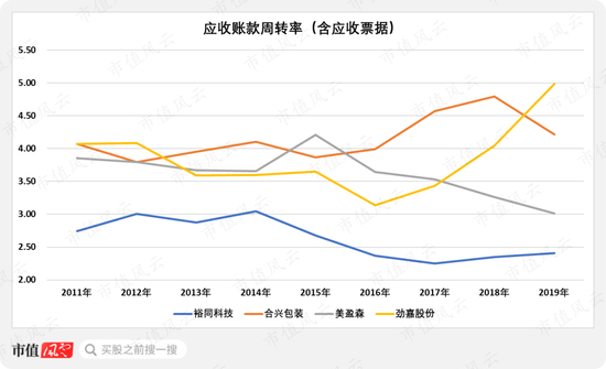 裕同科技自2014年起逐年下滑至2019年的2.88次,仅小幅高于美盈森和劲嘉股份。
