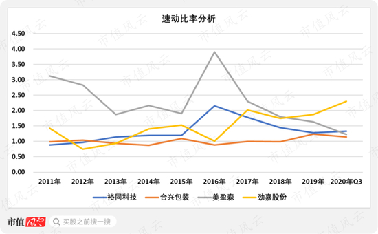裕同科技自2016年以来逐步下滑至2020年Q3的1.33,偿债能力比美盈森和合兴包装稍强。