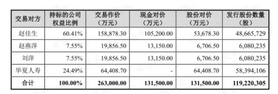 此次交易全部股份对价:以5.72元/股的价格向侯老板等股东定向发行2478.15万股,锁定期12个月。