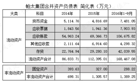 存货也是帕太集团的重要要资产,2016年前三季度,达4.2亿元,占流动资产的25%,与应收账款占比合计达88%。