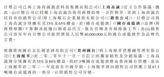 根据贵州国台文化创意酒有限公司(下称贵州国台)与上海酩萃供应链管理有限公司(下称上海酩萃)的独家销售及分销协议,上海酩萃将获得87.3吨国台成龙酒的分销资质,并向上海曜石企业发展有限公司供应其中一部分,供其销售。