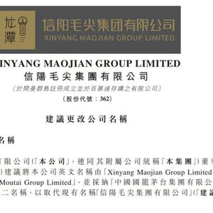 2月16日,港股公司信阳毛尖(信阳毛尖集团有限公司)公告,公司连同附属公司董事会建议,将公司英文名称由“Xinyang Maojian Group Limited”更改为“China Dragon Moutai Group Limited”,并采纳“中国国龙茅台集团有限公司”为公司的中文第二名称,以取代现有名称“信阳毛尖集团有限公司”。