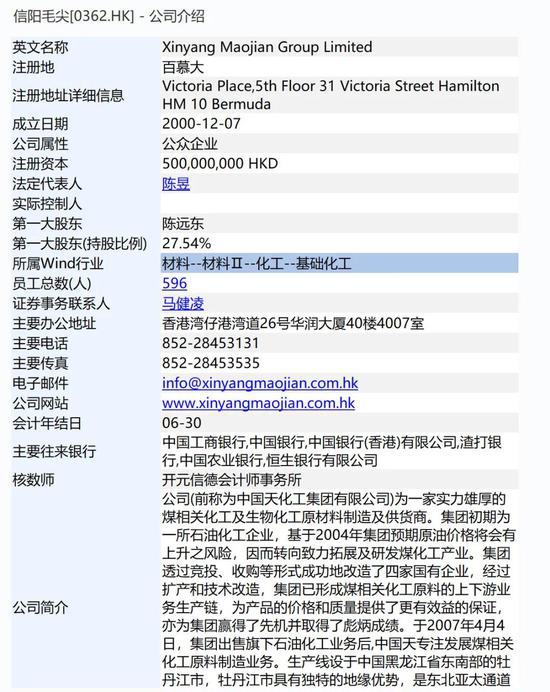 据介绍,信阳毛尖成立于2000年12月,注册地百慕大,第一大股东是陈远东,所属行业为基础化工,是一家煤相关化工及生物化工原材料制造及供应商。信阳毛尖的前一个名字叫“中国天化工集团有限公司”。