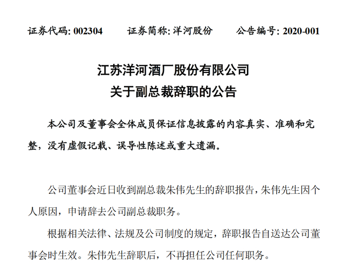 2020年1月17日,洋河股份发布公告,董事会近日收到副总裁朱伟的辞职报告,朱伟因个人原因,申请辞去公司副总裁职务;根据相关法律、法规及公司制度的规定,辞职报告自送达公司董事会时生效。朱伟辞职后,不再担任洋河股份任何职务。