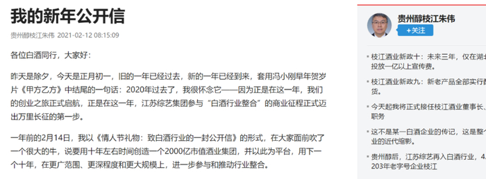 在2020年2月14日放话“十年创造2000亿市值酒企”之后,2021年2月12日,朱伟发布了新年公开信,贵州醇2020年扭亏为盈,销售增幅在200%以上,而枝江酒业也实现了阶段性扭亏。