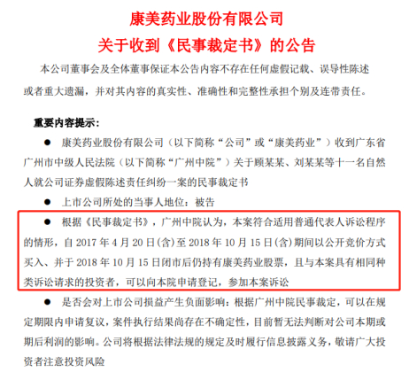 广州中院认为,本案符合适用普通代表人诉讼程序的情形,自 2017 年 4 月 20 日(含)至 2018 年 10 月 15 日(含)期间以公开竞价方式买入、并于 2018 年 10 月 15 日闭市后仍持有康美药业股票,且与本案具有相同种类诉讼请求的投资者,可以向本院申请登记,参加本案诉讼。