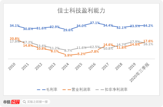 2019年,林肯电气的毛利率为33.5%,佳士科技整体毛利率33.9%,其中出口销售毛利率38.6%。另外,林肯电气最近两年的净利润率分别为9.5%、9.8%,分别低于佳士科技的扣非净利润率14.7%、17.9%。