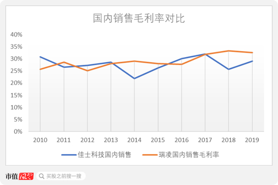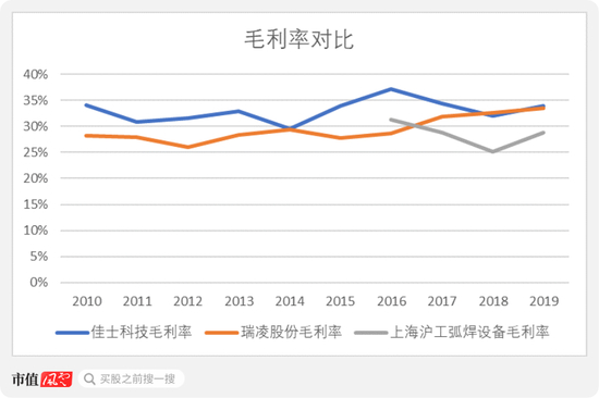 如果单看国内销售毛利率,瑞凌和佳士可以说是不相上下。