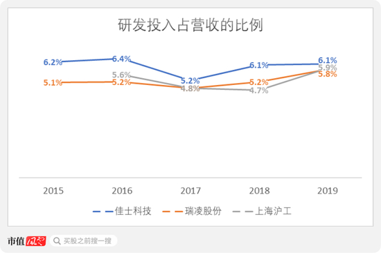 佳士科技研发投入占营收的比例相比瑞凌和上海沪工都要更高,其中2019年达到6.1%。三家公司的研发投入都全部费用化了。