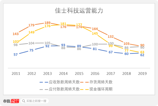 从实际结果看,2015年至今佳士科技的存货周转天数从174天下降到90天,同时应收账款周转天数也有所加快,带动现金循环周期减少了114天至63天。