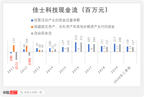 2013年至今,佳士的自由现金流始终为正,其中2019年经营活动净现金流2.2亿,自由现金流2.0亿。
