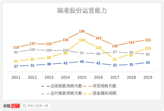 作为对比,瑞凌股份在近五年销售情况不佳的情况下(CAGR 0.1%),存货周转天数改善的幅度就没有那么大了,应收帐款周转天数则几乎没有变化。