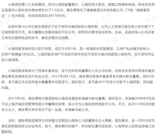 据《证券时报》报道,张腾鸿所执掌的心海系曾经在2017年4月向捷安德出资1.5亿元,后者于2015年曾入主珠海中富(000659.SZ),并于2018年破产,心海系投入的资金恐难以全额收回。