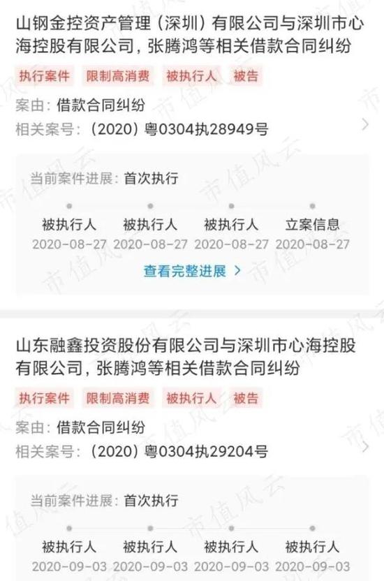 去年9月,张腾锦所持公司股份因借款合同纠纷被司法冻结。风云君在天眼查上发现,两起借款合同纠纷合计被执行金额为5148万元。