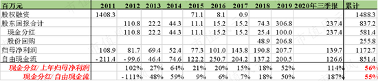 累计现金分红占累计上年归母净利润的比例高达56%,占累计当期自由现金流的比例高达55%。