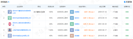 千鑫恒唯一的股东张腾锦,对外还投资了宝利海、心海投资等公司。其中心海投资的大股东是张腾鸿。