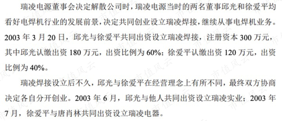 两家公司可以说是颇有渊源。佳士的创始人徐爱平和瑞凌股份实控人邱光都曾在瑞凌电源担任董事。后来瑞凌电源解散后,两人又分别出来创办了瑞凌电器(即佳士科技前身)和瑞凌股份。
