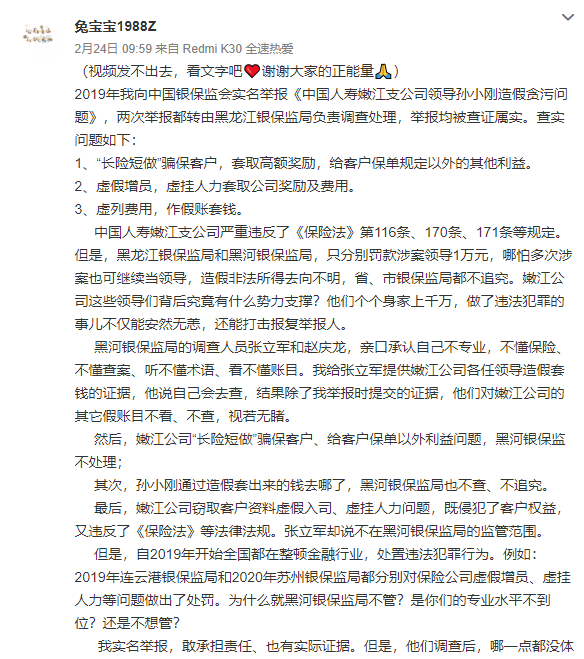 2月24日早间,员工实名举报中国人寿大量造假的消息冲上热搜,举报人是国寿的老员工,其实名举报公司领导涉嫌误导客户、虚假增员、虚列费用等造假贪污问题。