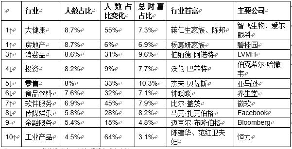 大健康是今年上升最快的行业。大健康和房地产成为全球十亿美金企业家的主要财富来源,其次是消费品、投资、零售和食品饮料。