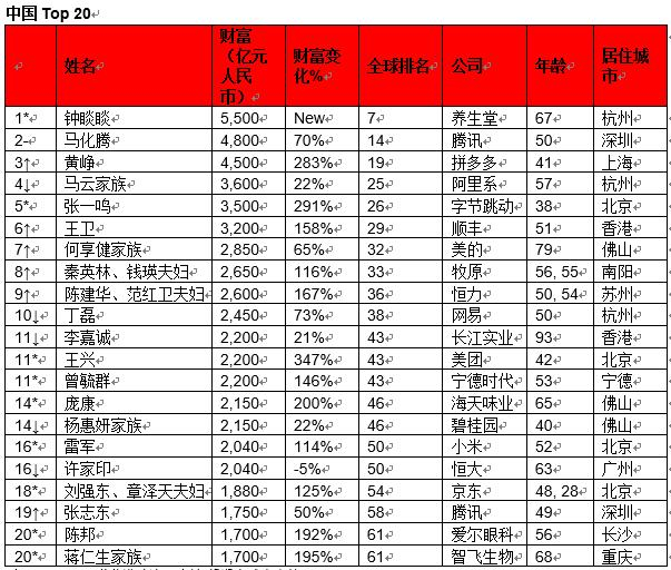 拼多多41岁的黄峥以4500亿元人民币的财富超过马云排到中国第三,涨了三倍。50岁的马化腾财富增长70%,以4800亿元人民币位列中国第二。