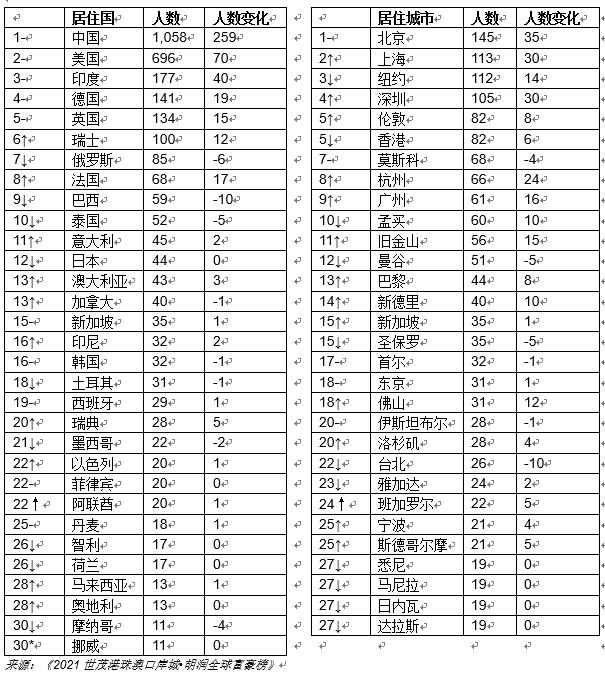 中国以1058位十亿美金企业家领先于美国,增加259位,而美国有696位,增加70位。印度排名第三,177人,增加了40人。德国、英国和瑞士分别100多人紧随其后。亚洲十亿美金企业家人数占全球51%,几百年来首次超过了世界其他地区的总和。