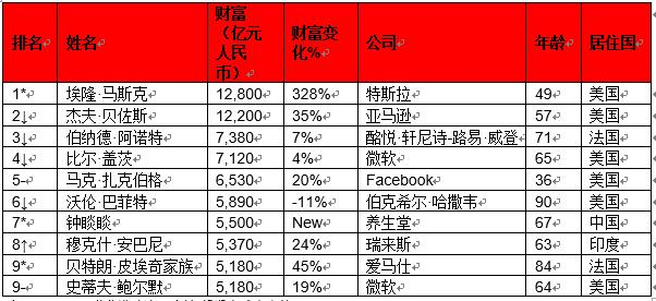 前十名中有3张新面孔:埃隆·马斯克、钟睒睒和贝特朗·皮埃奇。前十名企业家总财富比去年增长9%,达到7.3万亿人民币,占全榜单总财富的7.5%。6人来自美国,2人来自法国。前十名企业家财富平均涨幅超过50%。