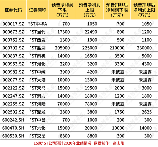 截至3月5日,共有15家*ST公司预计2020年净利润与扣非后净利润均为正。