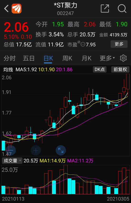 市场对此已经有所反馈。存在“脱帽摘星”预期的*ST聚力,在近期股价上涨明显。3月5日公司涨停,收盘价报收每股2.06元,上涨5.1%。
