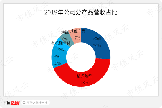 从收入构成来看,四大主营业务为公司中流砥柱。2019年,粘胶短纤在总营收中占比43%,为公司第一大收入来源;其次为纯碱业务,占比26%;其余PVC、烧碱、有机硅分别占营收比重为13%、6%及5%。