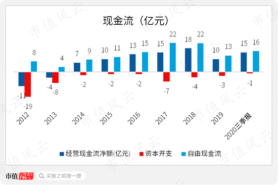 从现金流来看,经历了2012、2013两年经营现金流净流出,以及较大规模资本开支,导致自由现金流为负后,2014年开始,公司的经营现金流转正并呈现逐年增加态势,叠加规模适度的资本开支,自由现金流持续升高。