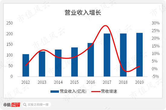 2012-2019年,公司营业收入由105亿元增至205亿元,CAGR为10%;2020年前三季度,公司实现营收126亿元,同比减少19%。