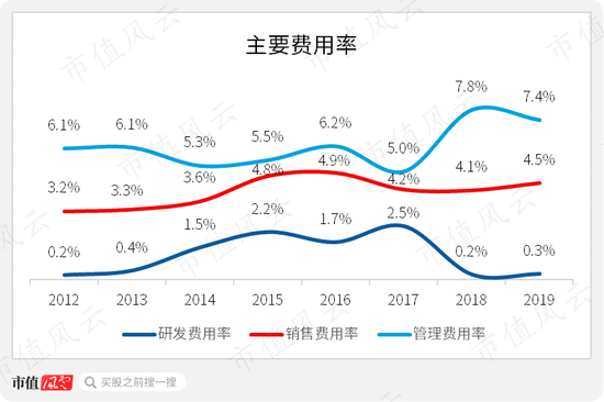 公司的主要费用率整体呈上升态势。管理费用率由2012年的6.1%上升至2019年的7.4%;同期,销售费用率由3.2%上升至4.5%;而研发费用率随公司年景起伏较大,2019年仅为0.3%。