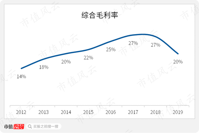 公司的综合毛利率整体处于提升态势,由2012年的14%,提升至2019年的20%。在多数年份,综合毛利率实现了持续稳定增长。