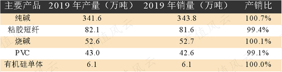 2019年公司共生产纯碱341.6万吨,销量343.8万吨,产销比为100.7%;粘胶短纤产量82.1万吨,销量81.6万吨,产销比为99.4%。