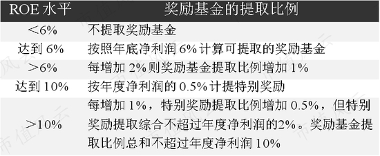 激励基金设定了6%的最低ROE水平,取得的ROE水平越高,奖励基金计提越多,但最高不超过年度净利润10%。奖励基金60%分配给公司高管人员,40%分配给公司员工。
