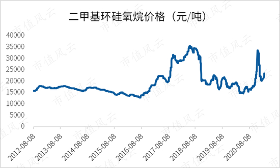 以此同时,有机硅中间体价格在2020年7月末达到最低14500元/吨,后续也进入上行通道;10月份价格上涨加速,由17700元/吨上涨至21600元/吨,涨幅达22%。截止2020年3月1日,有机硅中间体价格为23300元/吨。