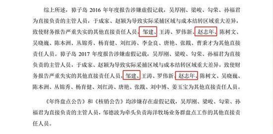 更精彩的还在后面,根据2019年7月10日证监会对獐子岛的处罚决定,上述两位董事邹建和赵志年荣升为董事长财务造假的同伙。如图: