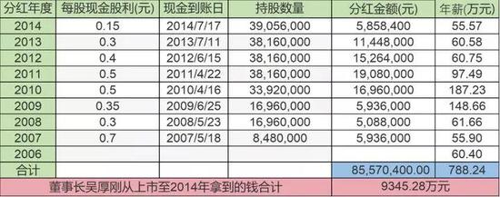 表面看来,从公开的上市分红从2006年獐子岛上市至2014年,吴厚刚从獐子岛拿到的所有面上的钱加起来,还不到1个亿(9345万)。