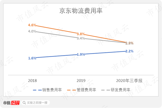 费用率当中,京东物流的管理费用率和研发费用率都在逐年下降,去年前三季度两者均为2.9%,只有销售费用率处于上升趋势,去年前三季度为2.2%。