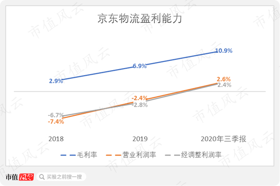 2020年前三季度,京东物流的毛利率仅为10.9%,同比提高了2.4个百分点;2019年的毛利率为6.9%,同比提高了4.0个百分点。
