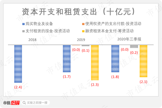 与此同时,京东物流购买物业及设备的开支有所减少,2018年为24亿,2019年为17亿;融资租赁的开支则有所增加,2018、2019年分别为0、23亿元。这样的做法会减少对当期现金流的影响。