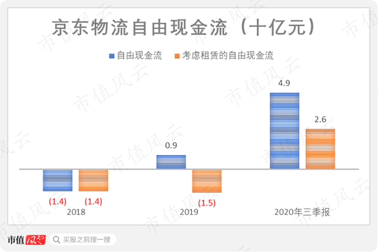 如果计算自由现金流,京东物流在2019年就已经实现净流入9亿元。但是如果考虑租赁的话(包括经营租赁和融资租赁),自由现金流直到去年前三季度才实现净流入(26亿元)。