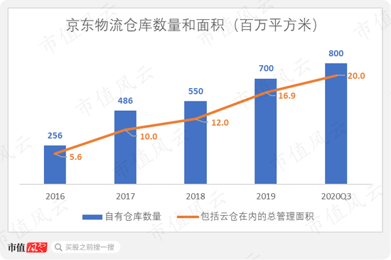 翻看过去几年京东物流的自有仓库数量和总仓储面积,可以发现两项数据一直在增长。