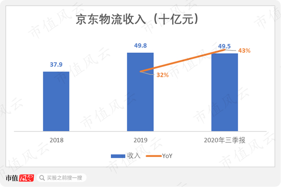 2019年,京东物流收入498亿元,同比增长32%;去年前三季度,收入为495亿元,同比增长43%。