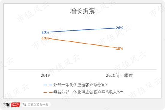 2019年,外部一体化供应链客户数量和平均贡献收入的增速分别为23%、19%。