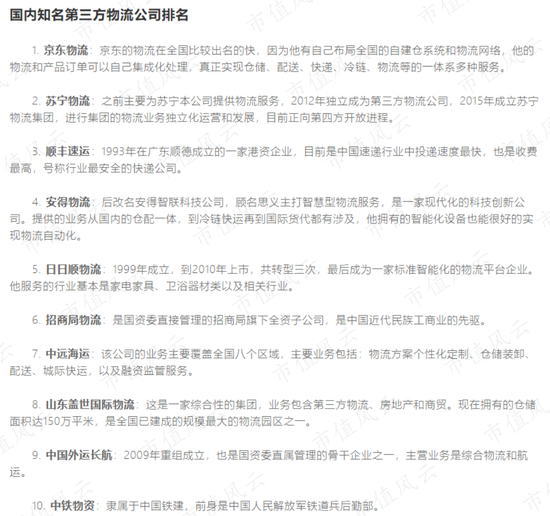 另外根据一份第三方数据,国内第三方物流公司的排名中,京东物流排第一,第二到五位分别是苏宁物流、顺丰速运、安得物流、日日顺物流。