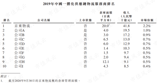 截至去年三季度末,京东物流拥有中国最大的仓储网络之一,包括800多个仓库,以及第三方运营的1400多个云仓,总面积2000万平方米,远超前十中的其他公司。