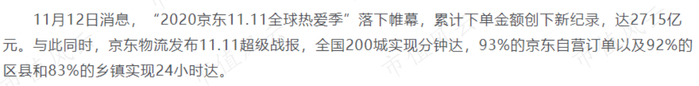 京东物流以其配送速度快和覆盖范围广而闻名:去年双十一,93%的京东自营订单以及92%的区县和83%的乡镇实现24小时达。